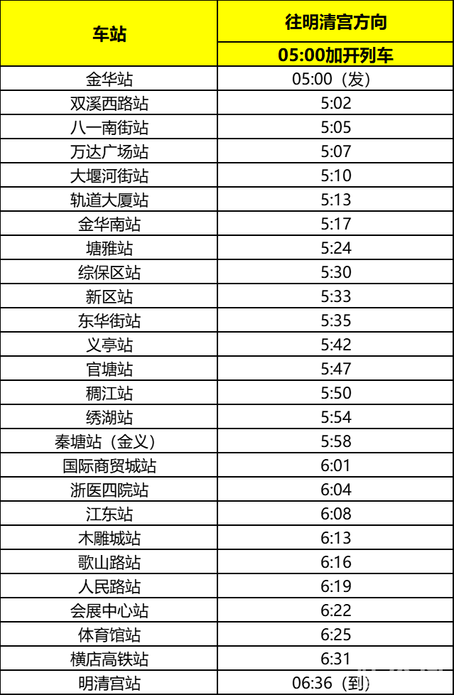 一、金华站单向加开1列次站站停载客列车至明清宫站(秦塘站无需下车换乘),加开列车不经过春晗站、凌云站,始发站为金华站,发车时间为5:00。