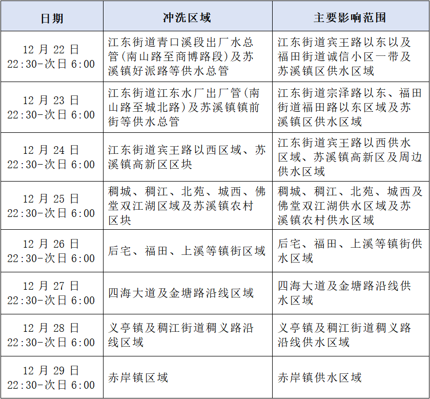 为保障供水水质安全,我司计划于2025年12月22日至12月29日的当日22:30至次日6:00实施城乡供水管网冲洗。届时冲洗区域内可能会出现水小、水浑等用水波动情况,请各用水户提前做好蓄水工作。恢复供水初期可能会出现短时水浑、水小、气泡等现象,可打开内部水龙头进行短暂排放处理,由此造成的不便敬请谅解。