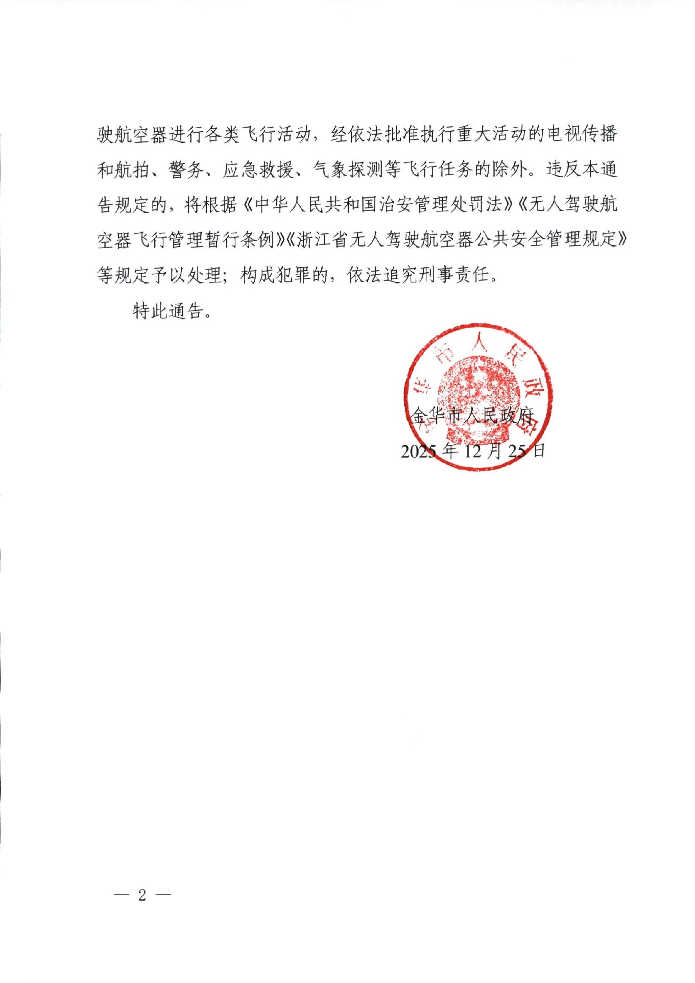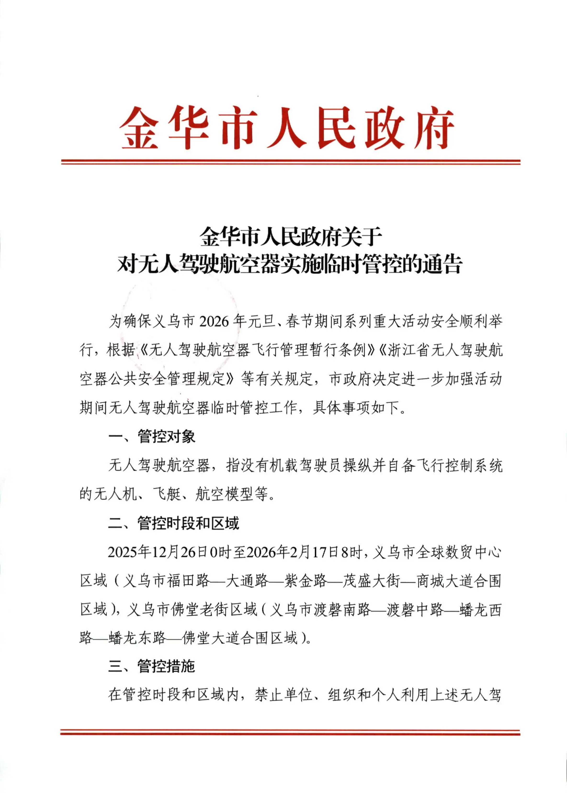 为确保义乌市2026年元旦、春节期间系列重大活动安全顺利举行,金华市人民政府决定自2025年12月26日0时至2026年2月17日8时,对义乌市全球数贸中心及佛堂老街区域进行临时性空域管控,相关事项公告如下: