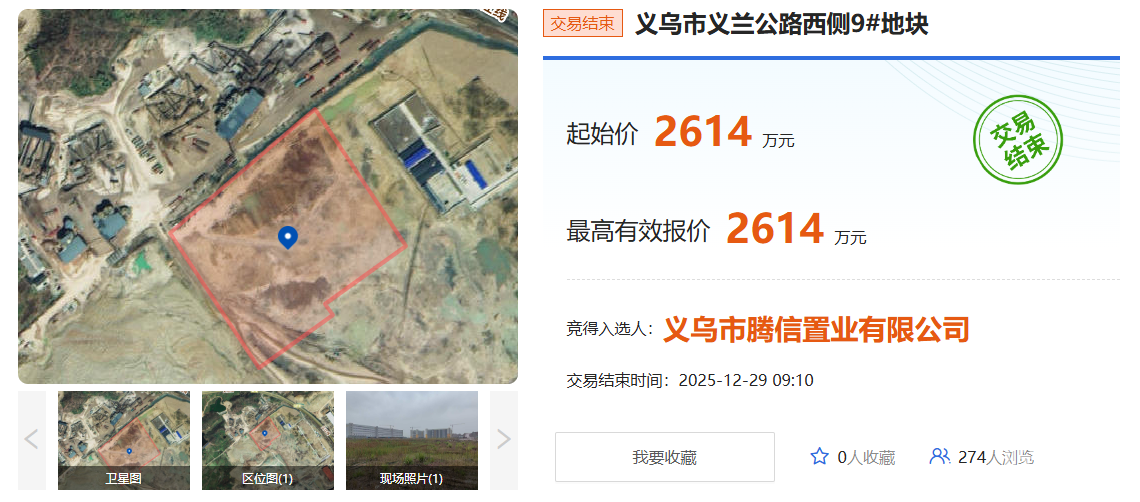 义乌市义兰公路西侧9# 地块 义乌市腾信置业有限公司以底价2614万元竞得该地块。 地块出让面积33333.33㎡(50亩),起始价2614万元,竞买保证金2614万元。 土地用途物流仓储用地,容积率3.0-4.0,建筑密度40%-60%,建筑高度≤50米,出让年期50年。 义乌市义兰公路西侧10# 地块 义乌市茗锦供应链管理有限公司以底价2614万元竞得该地块。 地块出让面积33333.34㎡(50亩),起始价2614万元,竞买保证金2614万元。 土地用途物流仓储用地,容积率3.0-4.0,建筑密度40%-60%,建筑高度≤50米,出让年期50年。 根据规划条件,地块内行政办公、生活服务设施等非生产性用房建筑占地不得超过地块总用地面积的7%,建筑面积不得超过地块总建筑面积的15%。禁止建造成套职工住宅、专家楼、宾馆和招待所等设施。 允许开发使用范围内的地下空间主体结构竖向利用深度为-8米以上。地下室仅用于人防、消防、停车、储藏等基础配套设施,严禁改变用途。 整理:义乌房子网