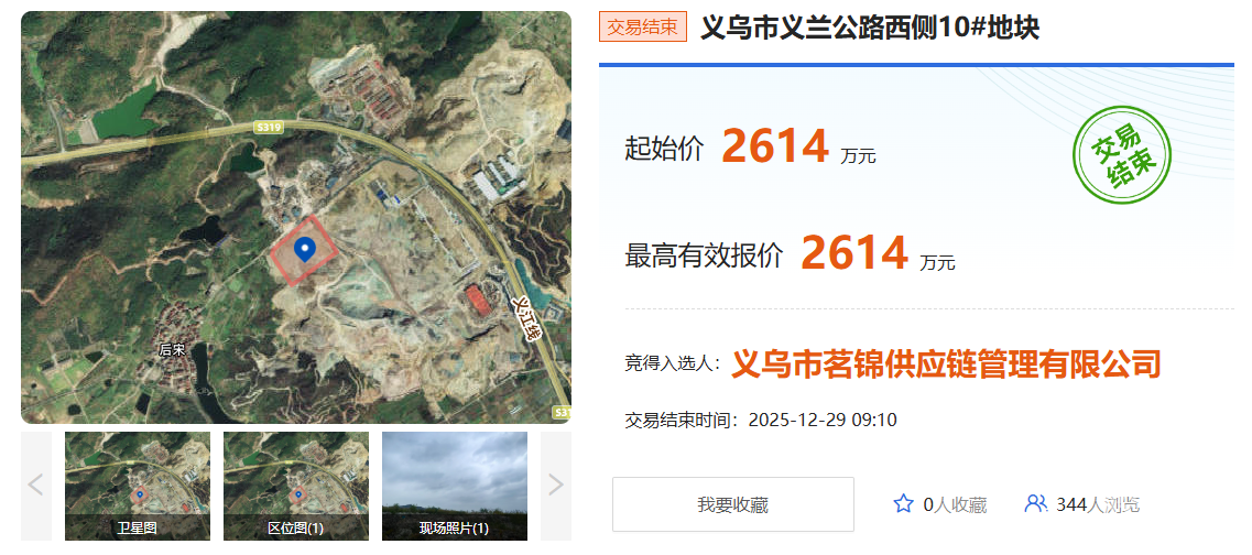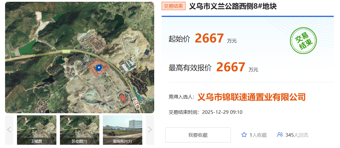 12月29日,义乌市义兰公路西侧8# 地块、9# 地块、10# 地块成功出让。 三宗地块成交总价7895万元,出让总面积99993.13㎡,约149.99亩,均位于上溪镇,义兰公路以西、余后路以南。 义乌市义兰公路西侧8# 地块 义乌市锦联速通置业有限公司以底价2667万元竞得该地块。 地块出让面积33326.46㎡(49.99亩),起始价2667万元,竞买保证金2667万元。 土地用途物流仓储用地,容积率3.0-4.0,建筑密度40%-60%,建筑高度≤50米,出让年期50年。