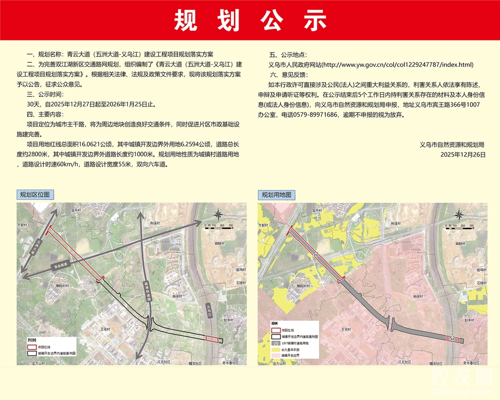 12月26日,青云大道(五洲大道-义乌江)建设工程项目规划落实方案进行了公示。