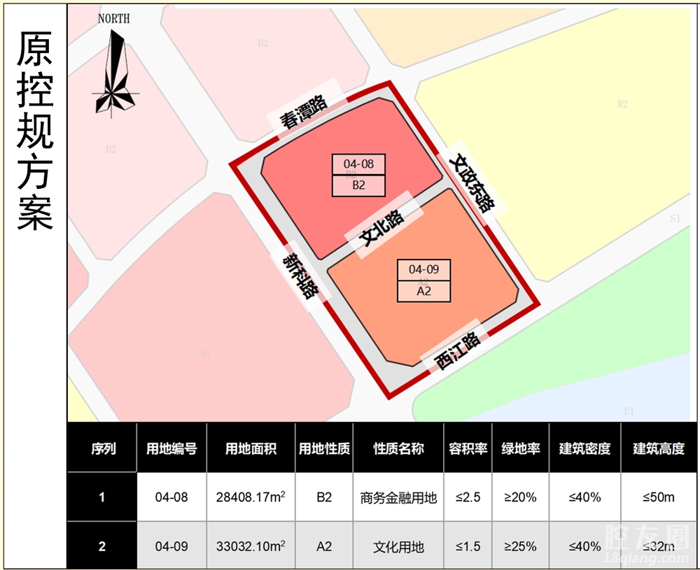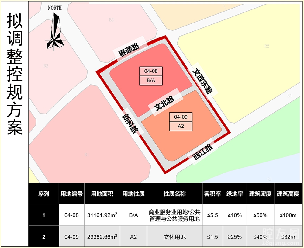 用地编号04-08商业服务业用地/公共管理与公共服务用地,用地面积31161.92㎡,容积率≤5.5,绿地率≥10%,建筑密度≤50%,建筑高度≤100米。
