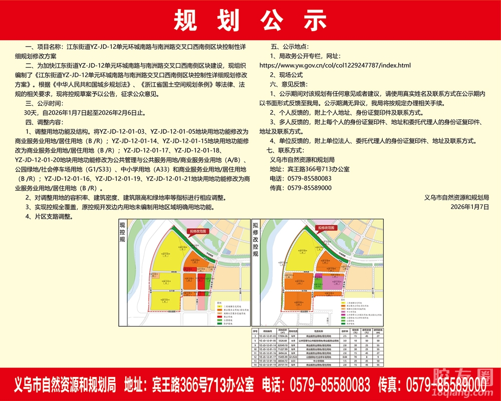 近日,江东街道YZ-JD-12单元环城南路与南洲路交叉口西南侧区块控制性详细规划修改方案、江东街道YZ-JD-0102单元环城南路与阳光大道交叉口东侧区块控制性详细规划、江东街道YZ-JD-01单元江东东路与春风大道交叉口东南侧区块控制性详细规划、稠江街道YZ-CJ-09单元新科路与西江路交叉口东北侧区块控制性详细规划修方案、稠江街道YZ-CJ-02单元五洲大道与伏龙山路交叉口南侧区块控制性详细规划公示。