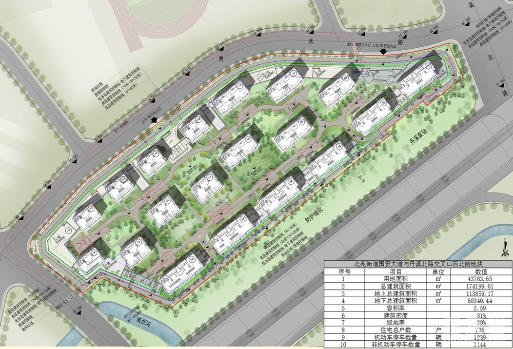 该项目位于北苑街道国贸大道与丹溪北路交叉口西北侧,用地面积43783.65㎡,用地性质为城镇住宅用地、商业用地