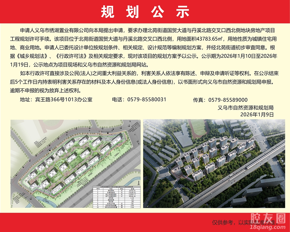 公示期为2026年1月10日至2026年1月19日,公示地点为项目现场和义乌市自然资源和规划局网站。