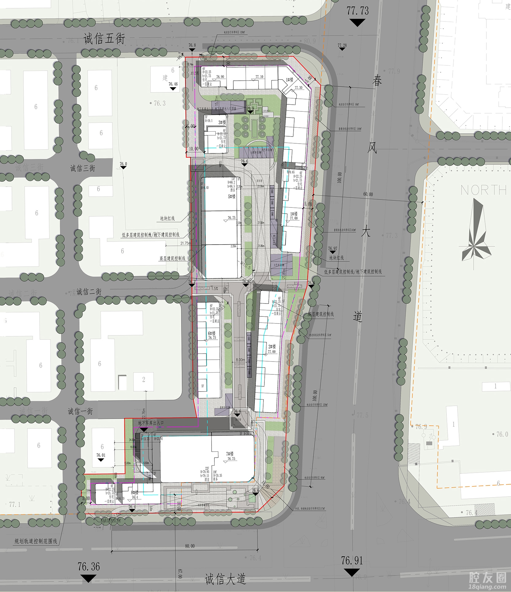 项目规划建设7栋建筑。其中5栋为住宅,建筑层数5-6层,2栋为酒店商务,建筑层数13层和22层。