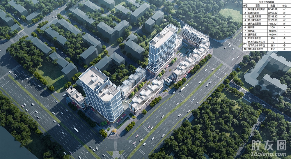 地块总建筑面积88962.80㎡,其中地上总建筑面积62589.80㎡,地下总建筑面积26373.00㎡,建筑基底面积7018.72㎡,容积率3.50,建筑密度40%,绿地率10%,机动车停车位400个,非机动车停车位432个。