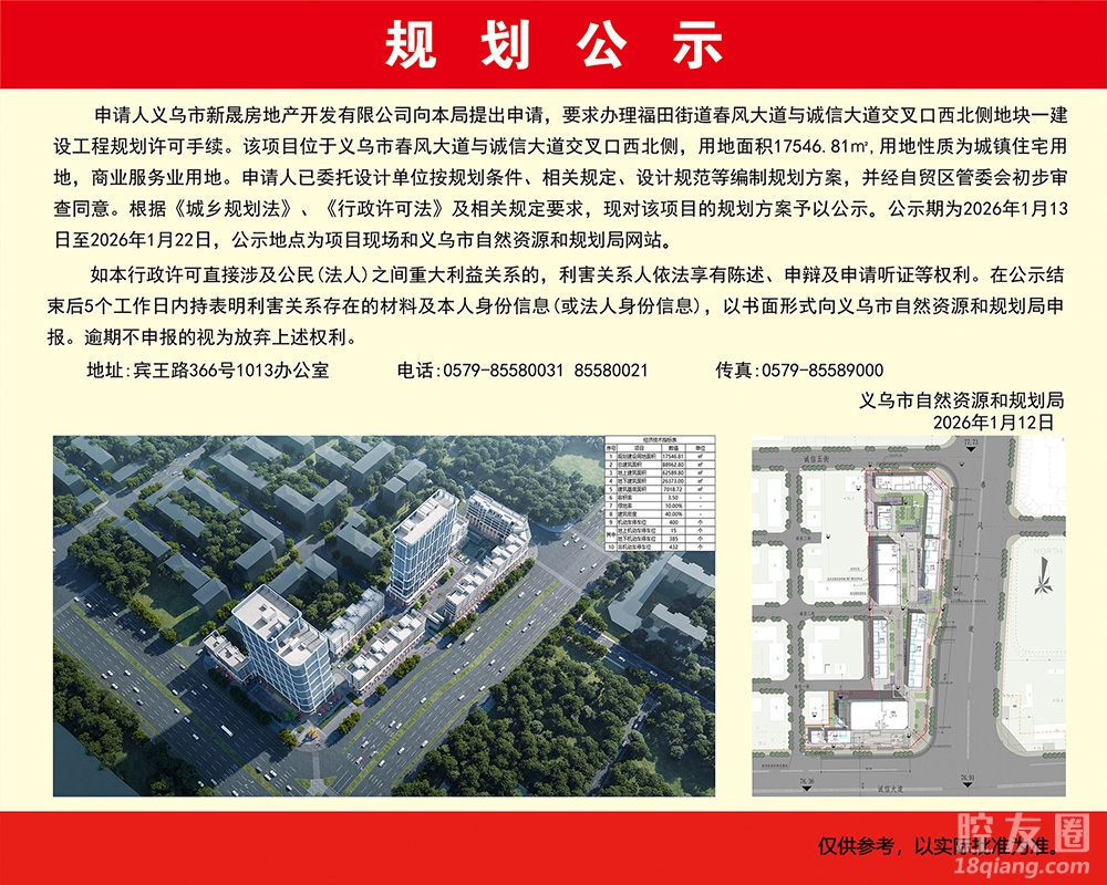 公示期为2026年1月13日至2026年1月22日,公示地点为项目现场和义乌市自然资源和规划局网站。