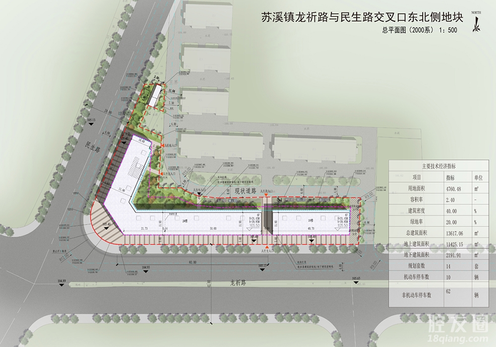 该项目位于义乌市苏溪镇龙祈路与民生路交叉口东北侧,用地面积4760.48㎡,用地性质为城镇住宅用地,商业用地。 地块总建筑面积13617.06㎡,其中地上总建筑面积11425.15㎡,地下总建筑面积2191.91㎡,容积率2.40,建筑密度40%,绿地率20%,机动车停车数10辆,非机动车停车数62辆。 项目规划2栋住宅,建筑层数6层,建筑高度21.45米,规划套数14套。