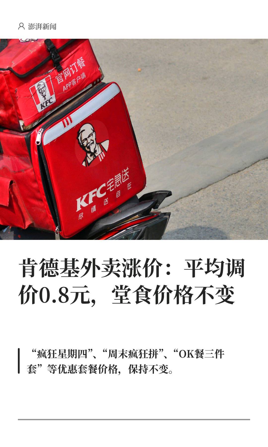 肯德基方面表示,为了更好地应对运营成本的变化,保持稳定健康的经营,公司在充分评估后,对部分外送产品的价格进行了调整。深受消费者喜爱的“疯狂星期四”、“周末疯狂拼”、“OK餐三件套”等优惠套餐价格,保持不变。(澎湃新闻·10%公司)