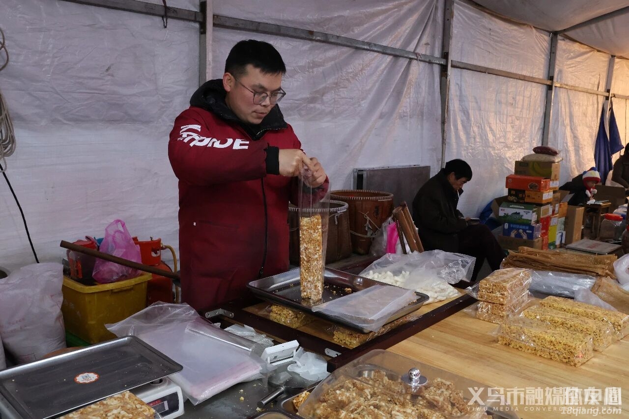 尽管雨丝如雾、天气微寒,但集市上的人流持续不断,随处可见提着大包小袋、面露喜悦的采购者。家住楂林一村的刘芳静提着刚买的菜籽油和豆腐包,穿梭在人群中。“我每年都来,就像过年必须走的流程一样。”她说,“儿子一家今年要从上海回来过年,我得多备点家乡味道。”