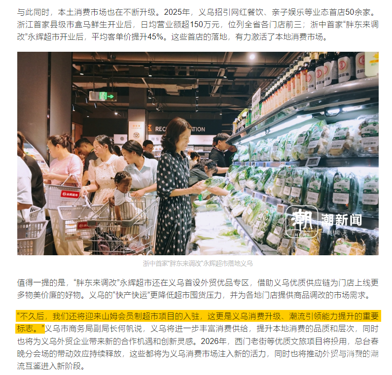 “不久后,我们还将迎来山姆会员制超市项目的入驻,这更是义乌消费升级、潮流引领能力提升的重要标志。”义乌市商务局副局长何帆说,义乌将进一步丰富消费供给,提升本地消费的品质和层次,同时也将为义乌外贸企业带来新的合作机遇和创新灵感。2026年,西门老街等优质文旅项目将投用,总台春晚分会场的带动效应持续释放,这些都将为义乌消费市场注入新的活力,同时也将推动外贸与消费的潮流互鉴进入新阶段。