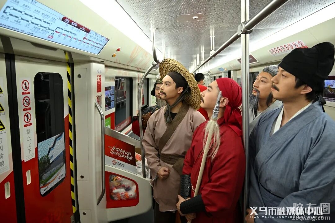 车厢内,由演员扮演的“六义”文化代表人物在列车上与乘客互动,让城市文化的传播更具温度与活力。“我们是嘉兴来义乌旅游的,一进车厢就被惊艳到了。”从凌云站上车的游客余梦嘉感慨道,“整个车厢都洋溢着浓浓的年味,还融入了满满的义乌特色。‘六义’人物的表演生动鲜活,让我对这座城市又多了几分了解。”同样被吸引的,还有来自河南鹤壁的乘客朱俊丹:“演员们的表演很有特色,车厢还装饰着义乌各大地标的风景图片,仿佛把整座城市的精华都‘打包’带到了车上,让我对义乌有了更深的认识。”
