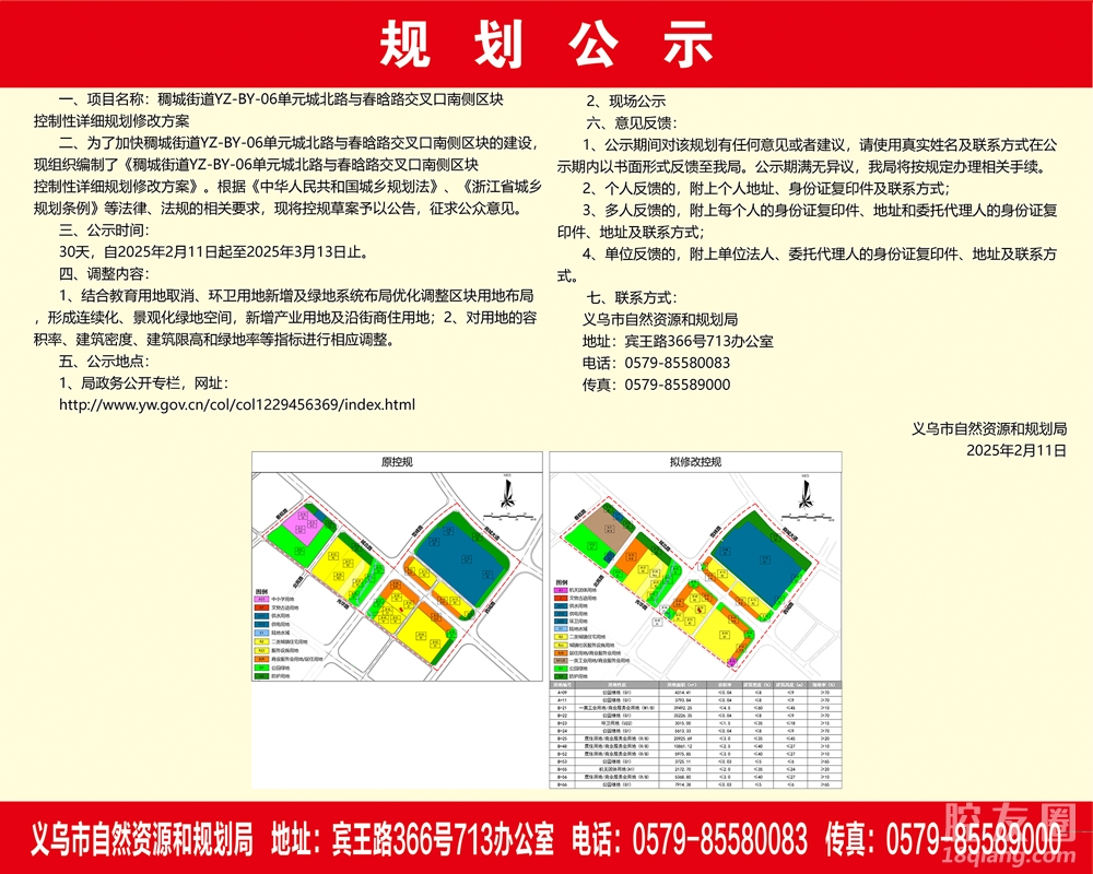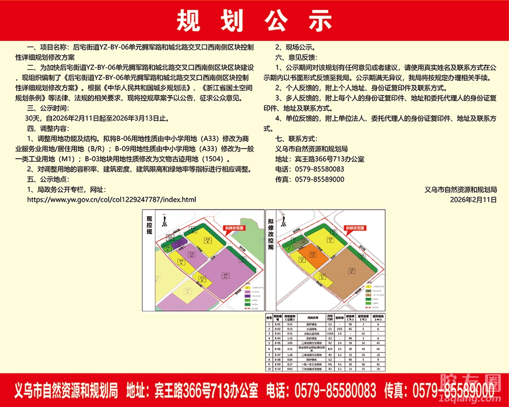 2月11日,后宅街道YZ-BY-06单元拥军路和城北路交叉口西南侧区块控制性详细规划修改方案、稠城街道YZ-BY-06单元城北路与春晗路交叉口南侧区块控制性详细规划修改方案公示。