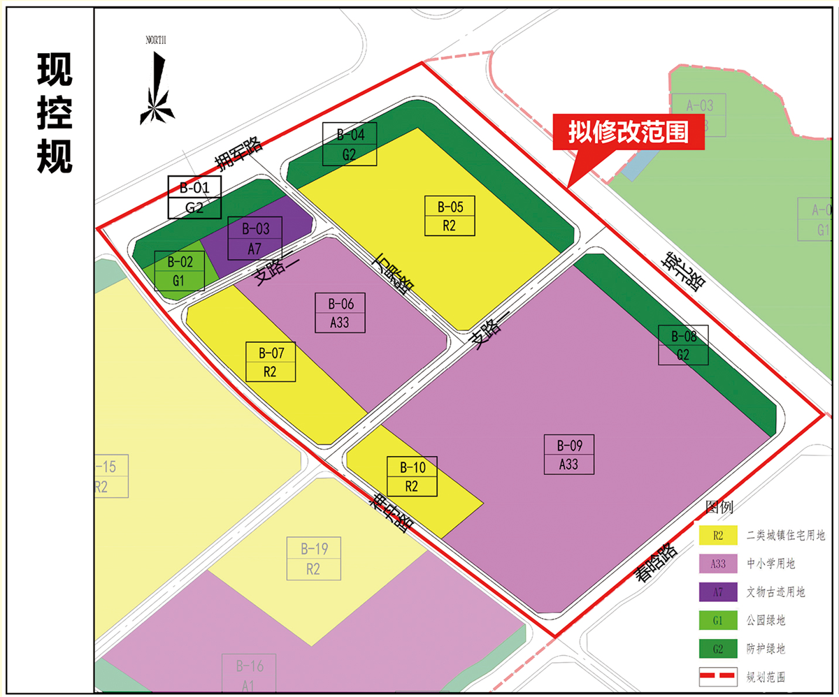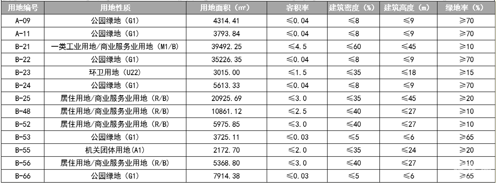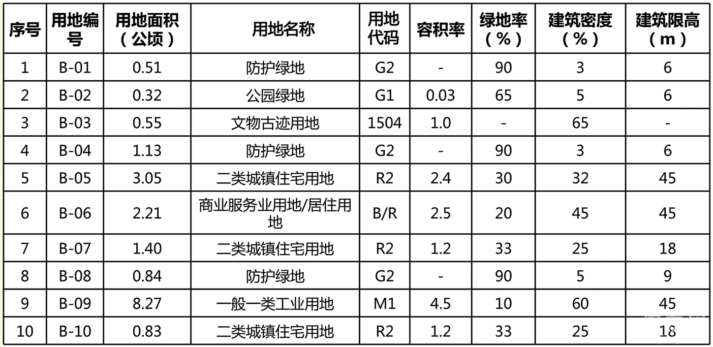 调整内容:1、调整用地功能及结构。拟将B-06用地性质由中小学用地(A33)修改为商业服务业用地/居住用地(B/R);B-09用地性质由中小学用地(A33)修改为一般一类工业用地(M1);B-03地块用地性质修改为文物古迹用地(1504)。2、对调整用地的容积率、建筑密度、建筑限高和绿地率等指标进行相应调整。