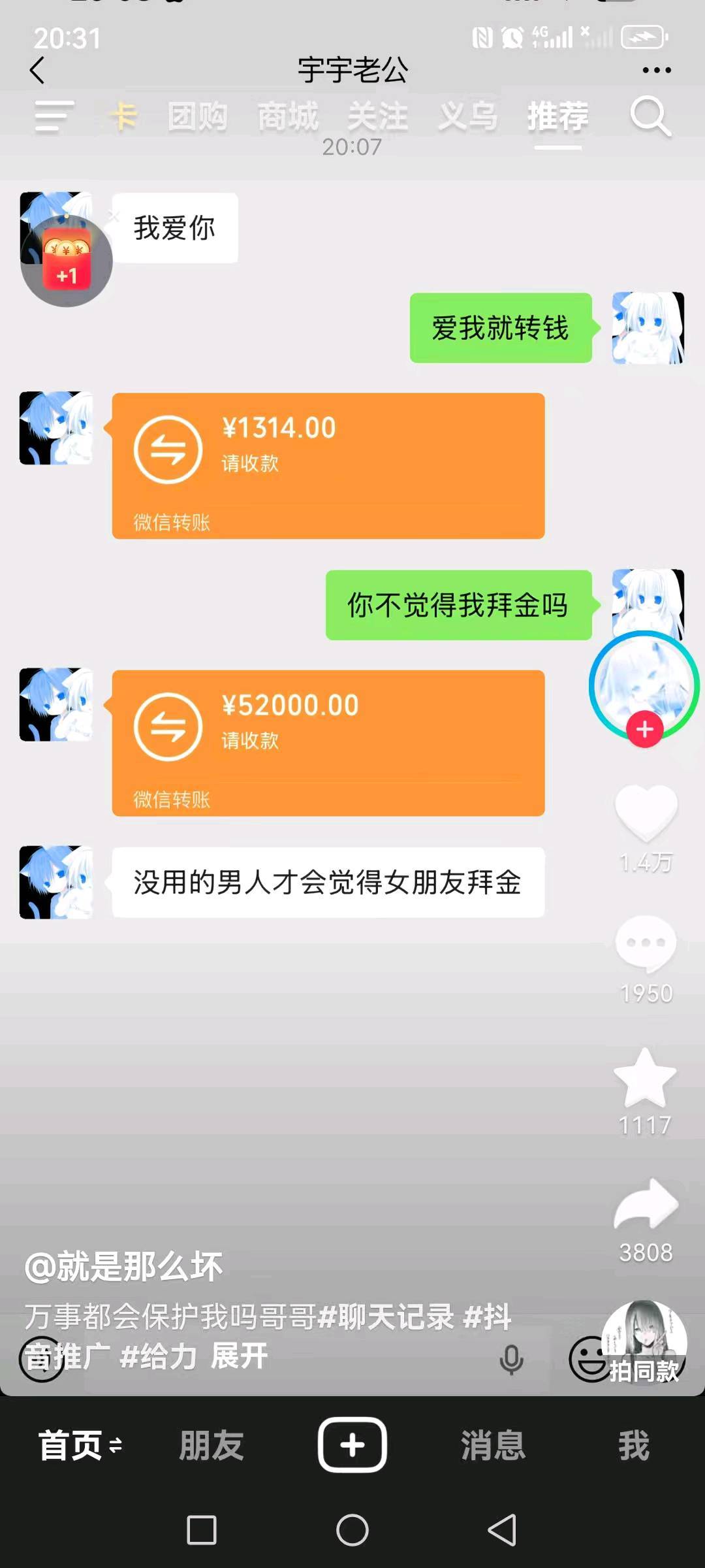 这些是不是专门推给那些女人呢?反正我是一个没刷到。我老婆刷10个视频,9个视频都是这种情人节发红包视频,并且都不小得