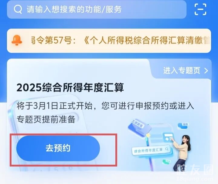 1、进入个人所得税App预约功能页面可通过“首页-2025综合所得年度汇算”专题区域点击“去预约”按钮进入预约功能页面;