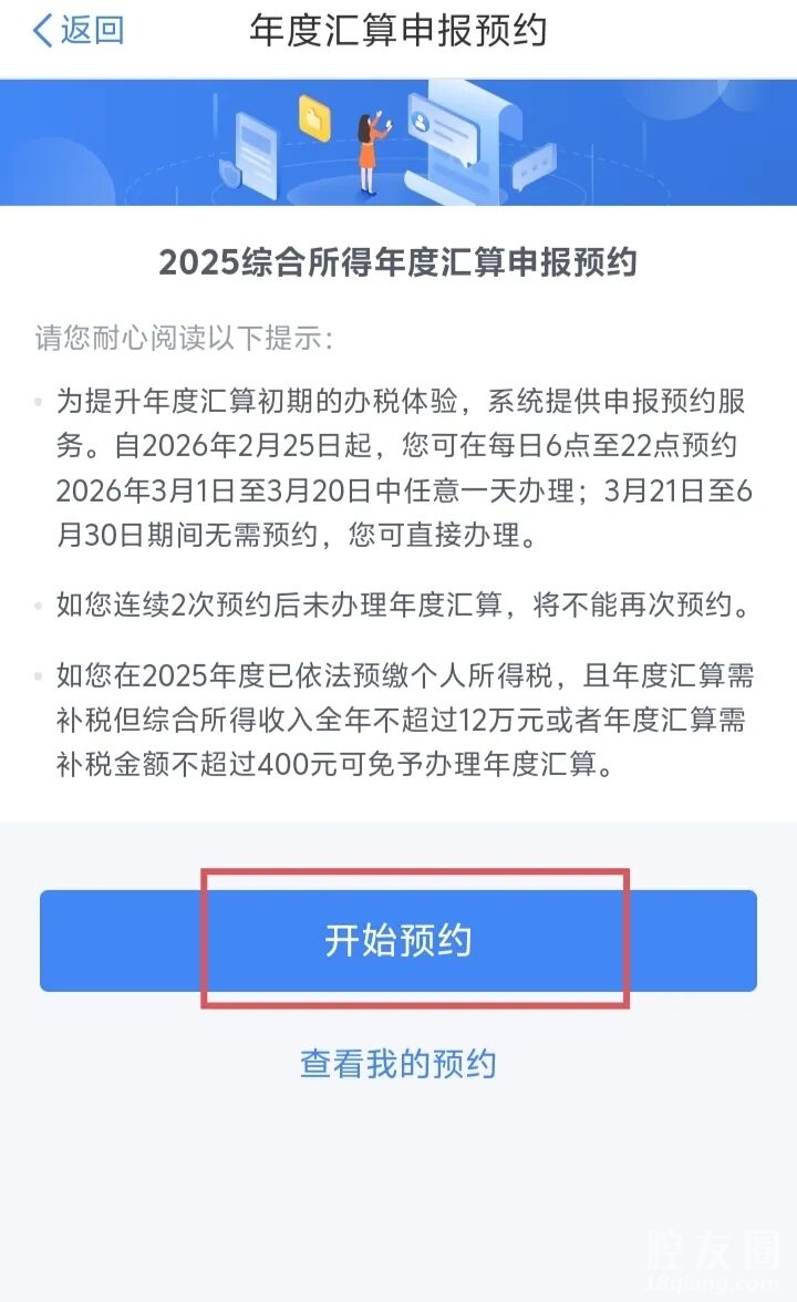 申报预约功能于2026年2月25日开通,纳税人如需在汇算初期(3月1日至20日之间)办理,可在2月25日起(每日6:00-22:00)通过个人所得税App预约上述时间段中的任意一天办理。