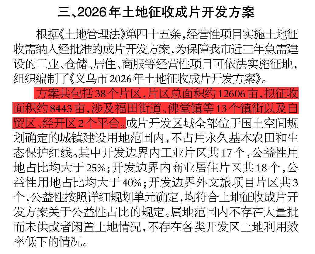 3月2日,《义乌商报》刊发《关于义乌市2025年国民经济和社会发展计划执行情况及2026年国民经济和社会发展计划草案的报告》,文中提及2026年土地征收成片开发方案