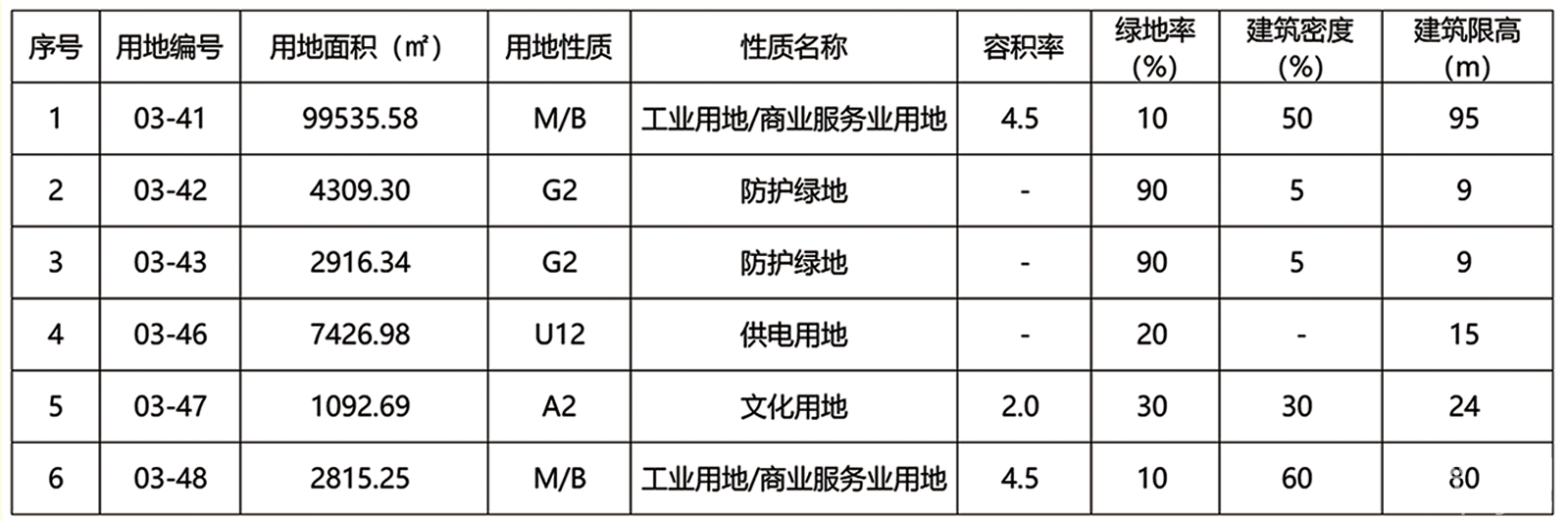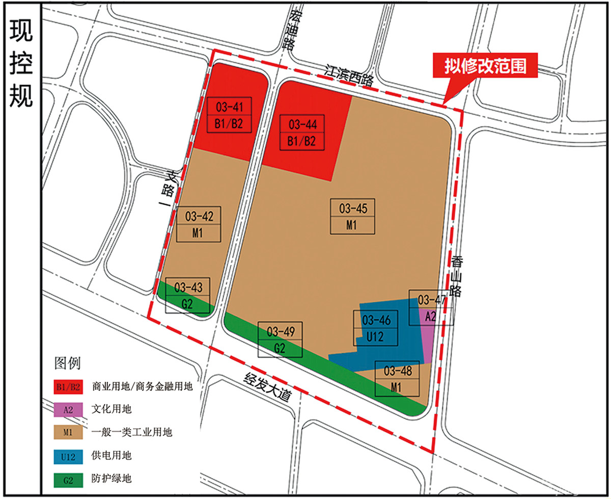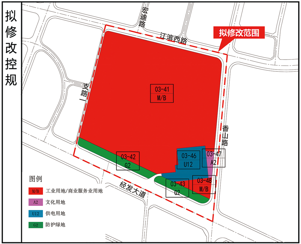 公示时间:30天,自2026年3月11日起至2026年4月10日止。调整内容:1、调整用地功能。拟将商业用地/商务金融用地(B1/B2)和一般一类工业用地(M1)修改为工业用地/商业服务业用地(M/B)。2、对调整用地的容积率、建筑密度、建筑限高和绿地率等指标进行相应调整。3、取消规划宏迪路,明确变电站的出入口,调整防护绿地范围。