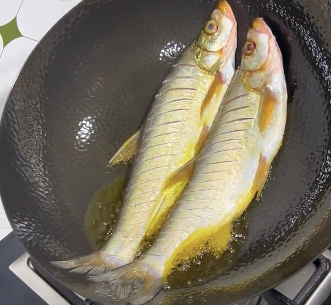 先把翘嘴煎至两面金黄,再撒上盐再加上葱花料酒<e>偷笑</e><e>偷笑</e>