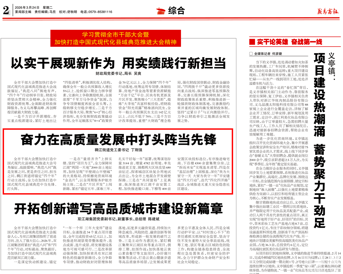全市干部大会暨加快打造中国式现代化县域典范推进大会号角催征、战鼓擂响。“典范八问”既是发展之问,更是责任之问、担当之问。稠江街道将锚定“四个年”行动主战场,全力在加快打造中国式现代化县域典范中当先锋、打头阵。