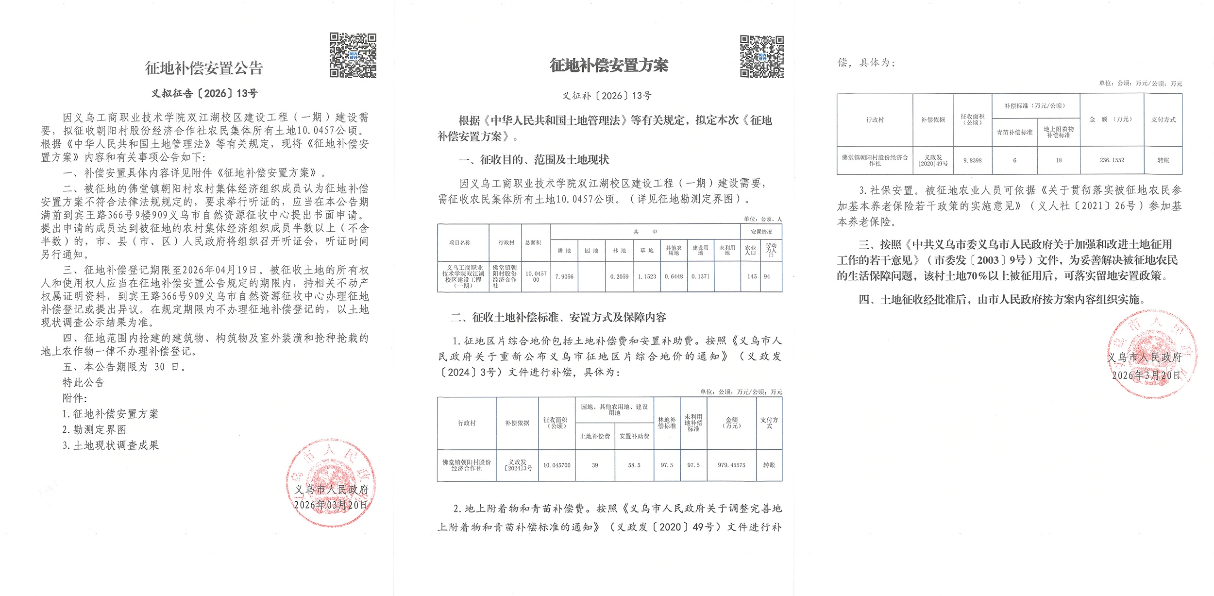 3月20日,义乌工商职业技术学院双江湖校区建设工程(一期)征地补偿安置方案公布。