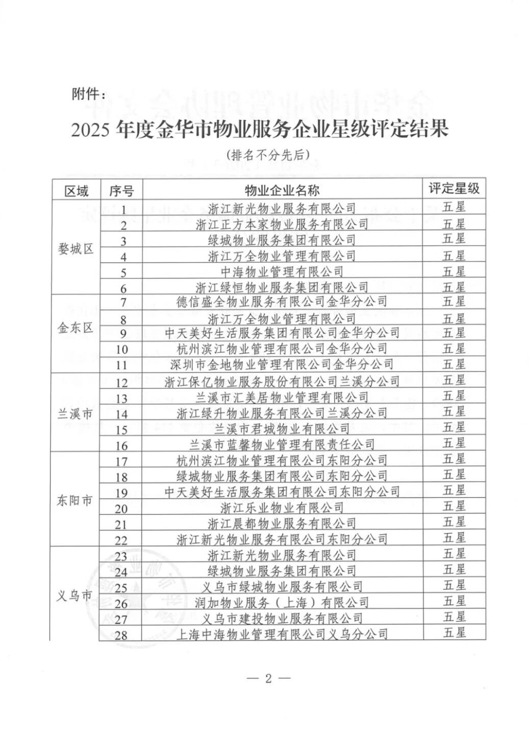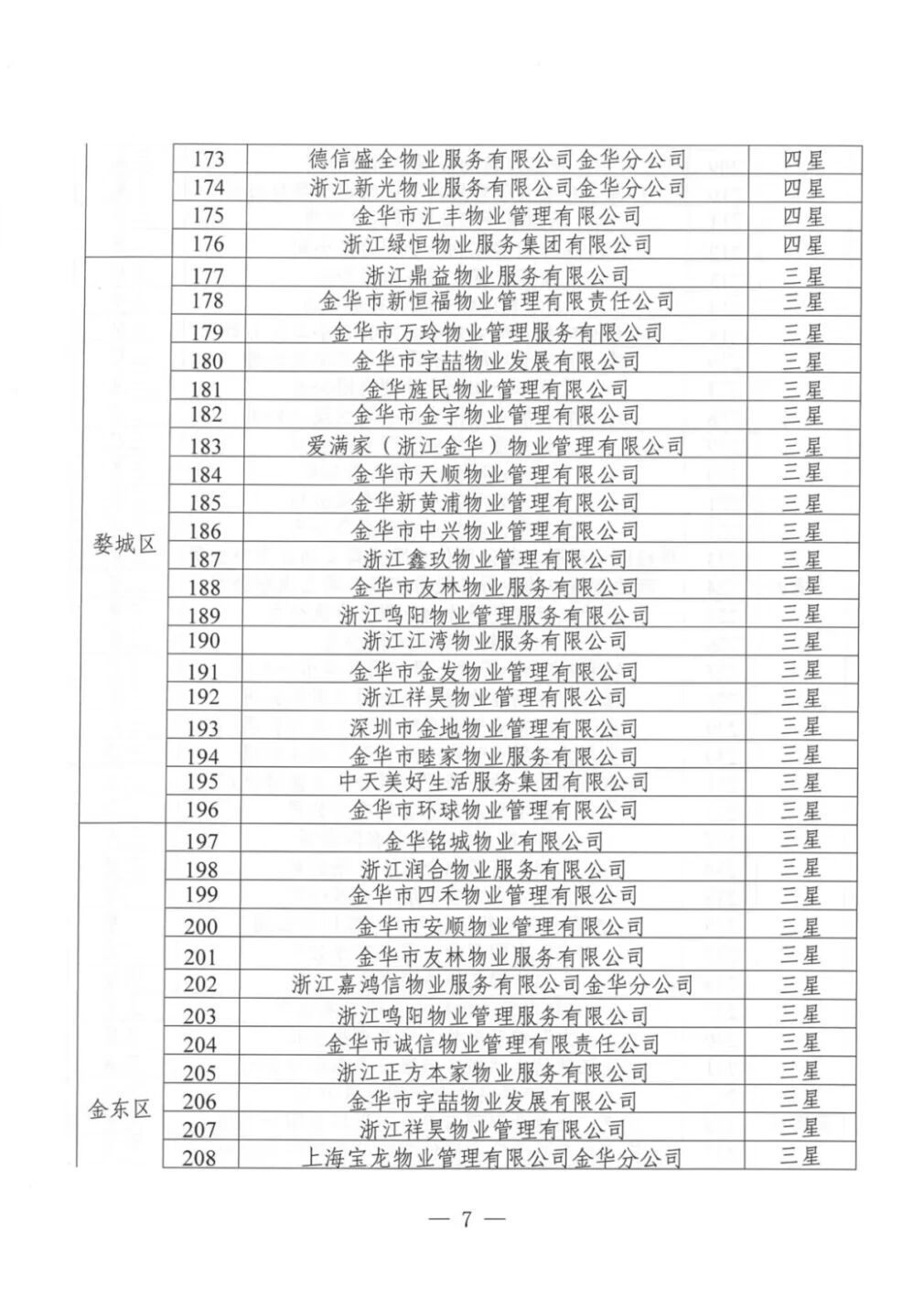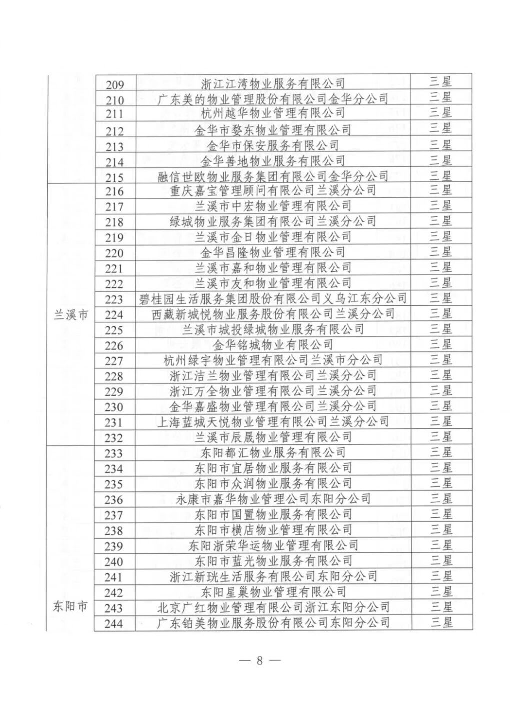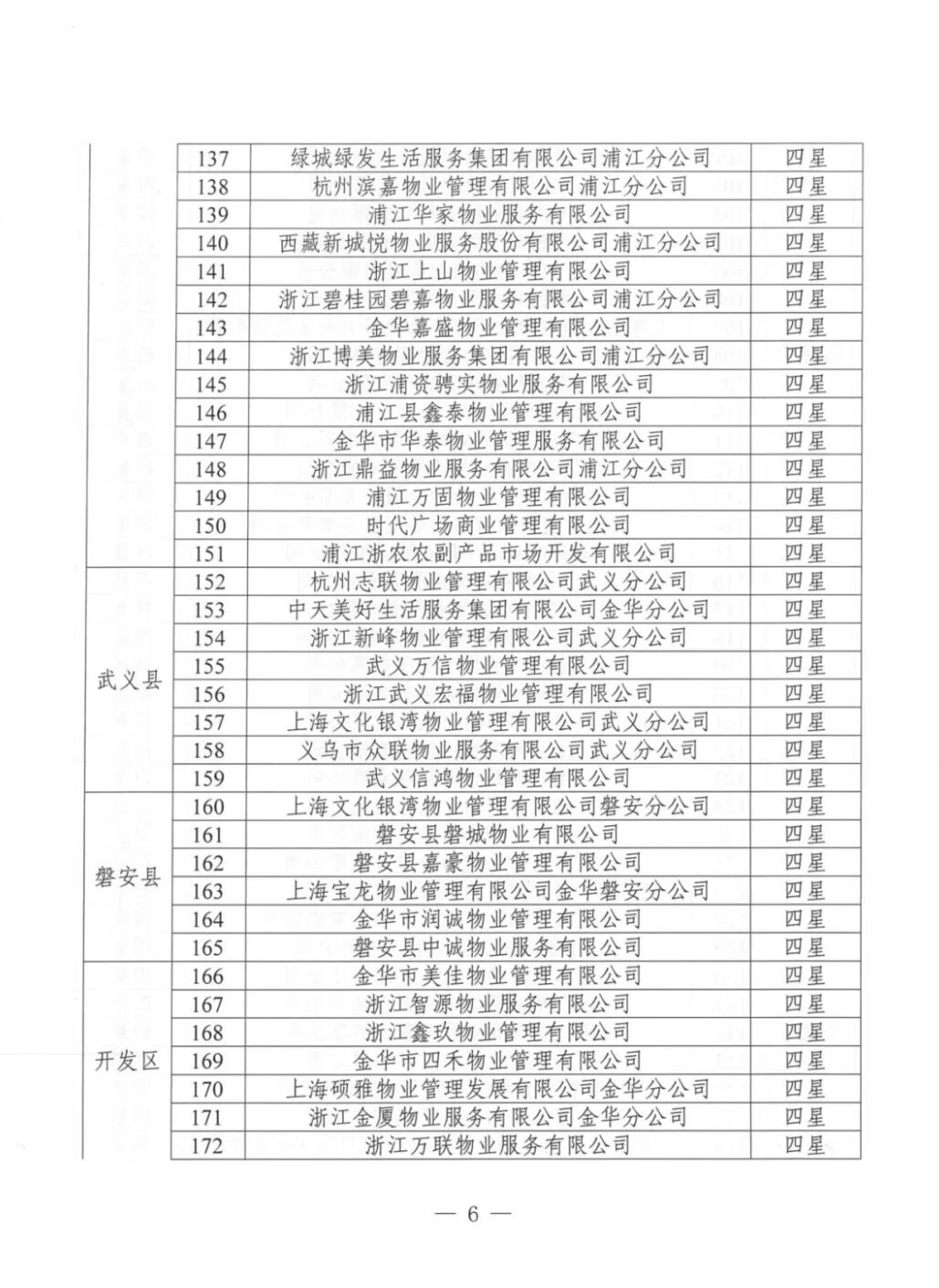 为加强物业服务行业自律,提高物业服务企业水平,优化群众生活居住环境,根据《金华市住宅小区物业服务质量评价办法(试行)》(金市建〔2023〕189号)《金华市住宅小区物业服务质量评价评分标准(试行)》等文件要求,通过街道(乡镇)评价、物业主管部门复核,现将下发物业服务企业星级评定结果。