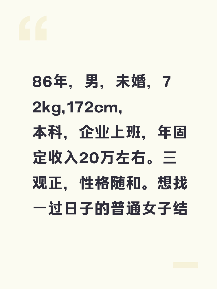 86年,男,未婚,72kg,172cm,本科,企业上班,年固定收入20万左右。三观正,性格随和。想找一过日子的普通女子结婚生子。 学历高中或中专及以上,相貌一般,外地本地都可,有意者加私信我。