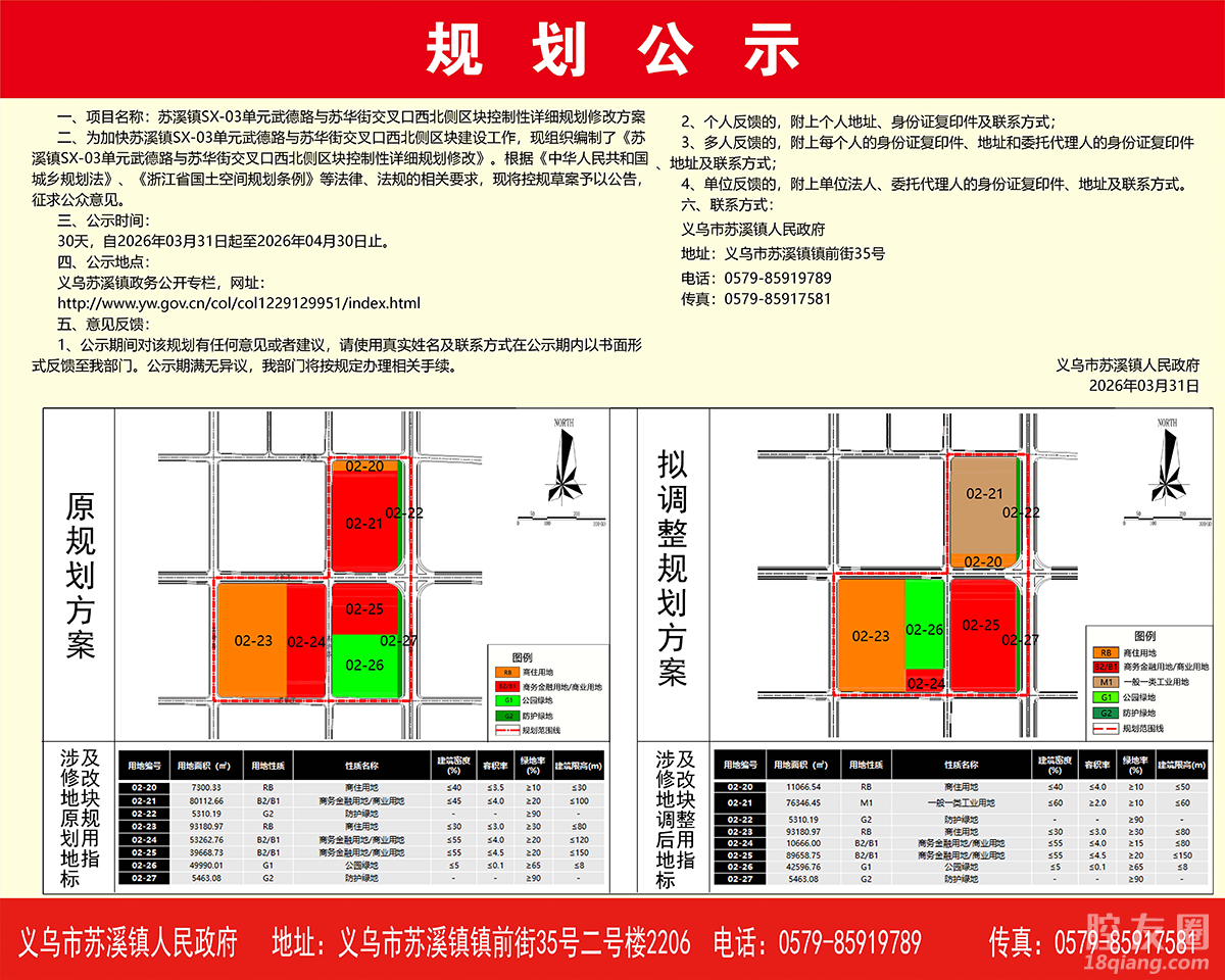 3月31日,苏溪镇SX-03单元武德路与苏华街交叉口西北侧区块控制性详细规划修改方案公示。