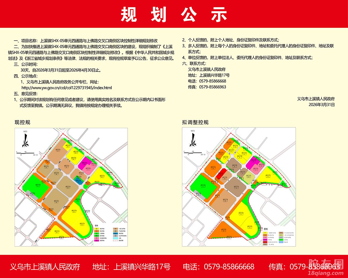 3月31日,上溪镇SHX-05单元四通路与上佛路交叉口南侧区块控制性详细规划修改公示。