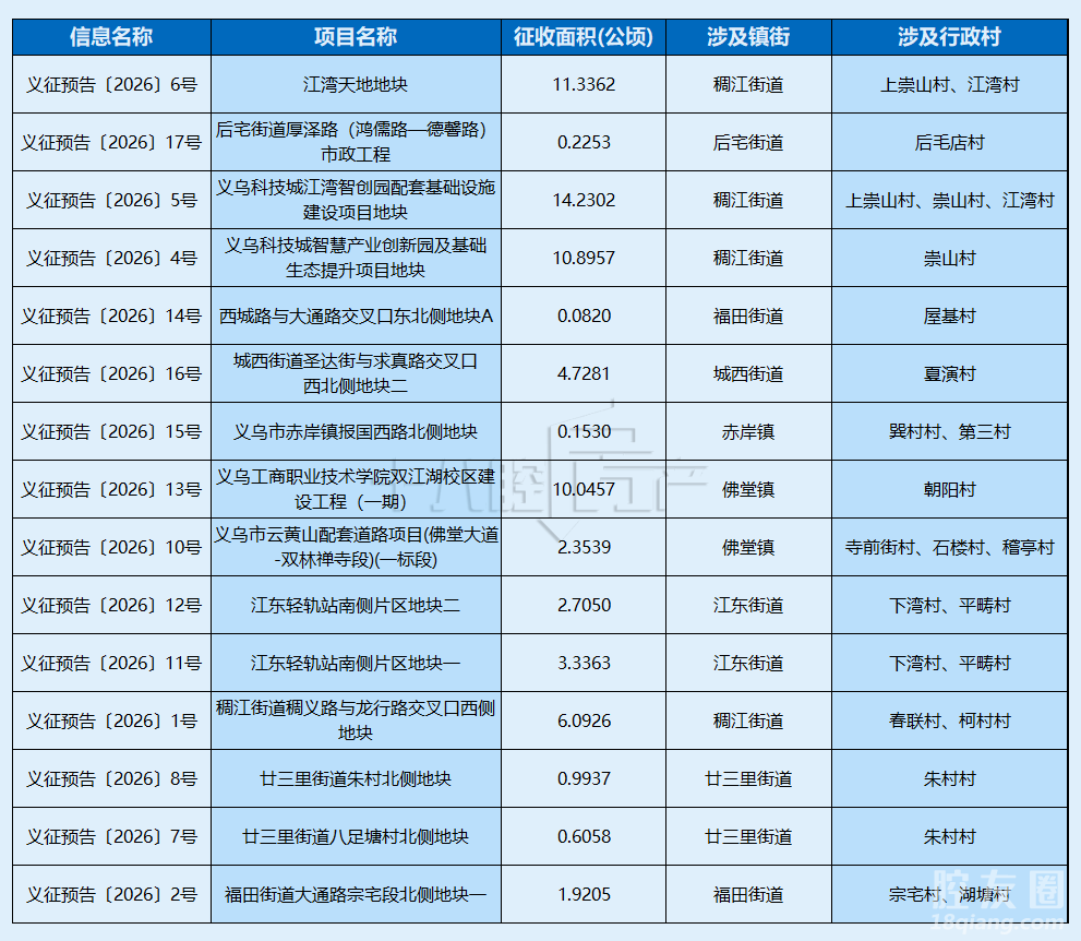 近日,义乌市自然资源征收中心发布多则征收土地预公告。 涉及城西、赤岸、稠江 、佛堂、福田、后宅、江东、廿三里等镇街的19个村,征收总面积69.704公顷,约1045.56亩。  义征预告〔2026〕6号项目名称:江湾天地地块征收范围:稠江街道上崇山村、江湾村征收面积:11.3362公顷  义征预告〔2026〕17号项目名称:后宅街道厚泽路(鸿儒路—德馨路)市政工程征收范围:后宅街道后毛店村征收面积:0.2253公顷 义征预告〔2026〕5号项目名称:义乌科技城江湾智创园配套基础设施建设项目地块征收范围:稠江街道上崇山村、崇山村、江湾村征收面积:14.2302公顷  义征预告〔2026〕4号项目名称:义乌科技城智慧产业创新园及基础生态提升项目地块征收范围:稠江街道崇山村征收面积:10.8957公顷  义征预告〔2026〕14号项目名称:西城路与大通路交叉口东北侧地块a征收范围:福田街道屋基村征收面积:0.082公顷  义征预告〔2026〕16号项目名称:城西街道圣达街与求真路交叉口西北侧地块二征收范围:城西街道夏演村征收面积:4.7281公顷  义征预告〔2026〕15号项目名称:义乌市赤岸镇报国西路北侧地块征收范围:赤岸镇巽村村、第三村征收面积:0.153公顷  义征预告〔2026〕13号项目名称:义乌工商职业技术学院双江湖校区建设工程(一期)征收范围:佛堂镇朝阳村征收面积:10.0457公顷  义征预告〔2026〕10号项目名称:义乌市云黄山配套道路项目(佛堂大道-双林禅寺段)(一标段)征收范围:佛堂镇寺前街村、石楼村、稽亭村征收面积:2.3539公顷  义征预告〔2026〕12号项目名称:江东轻轨站南侧片区地块二征收范围:江东街道下湾村、平畴村征收面积:2.705公顷  义征预告〔2026〕11号项目名称:江东轻轨站南侧片区地块一征收范围:江东街道下湾村、平畴村征收面积:3.3363公顷  义征预告〔2026〕1号项目名称:稠江街道稠义路与龙行路交叉口西侧地块征收范围:稠江街道春联村、柯村村征收面积:6.0926公顷  义征预告〔2026〕8号项目名称:廿三里街道朱村北侧地块征收范围:廿三里街道朱村村征收面积:0.9937公顷  义征预告〔2026〕7号项目名称:廿三里街道八足塘村北侧地块征收范围:廿三里街道朱村村征收面积:0.6058公顷  义征预告〔2026〕2号项目名称:福田街道大通路宗宅段北侧地块一征收范围:福田街道宗宅村、湖塘村征收面积:1.9205公顷  整理:义乌房子网